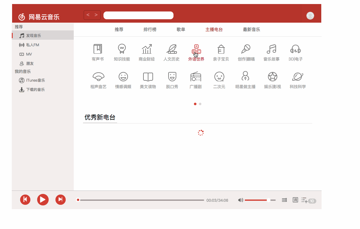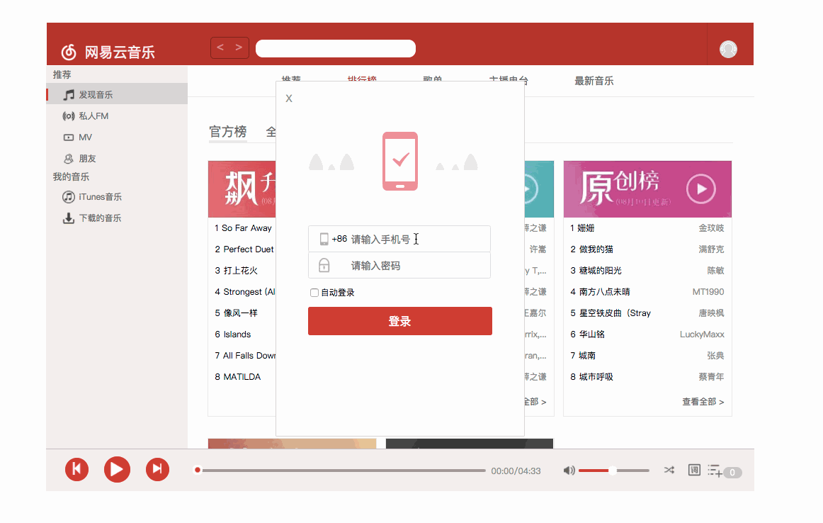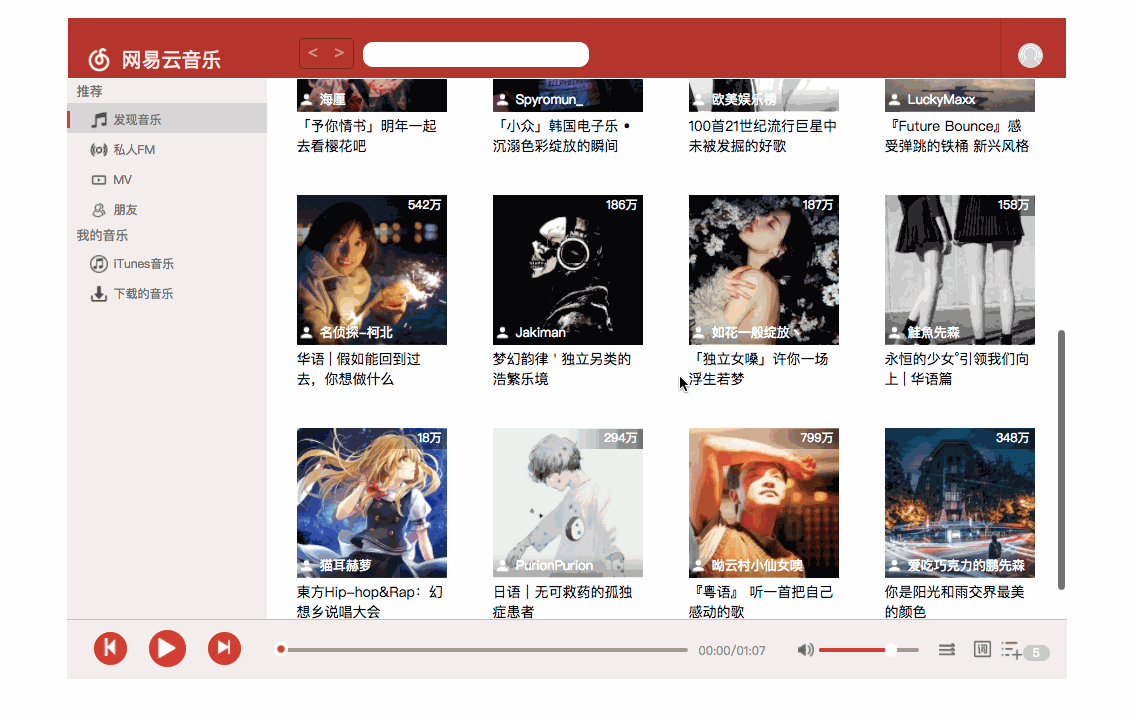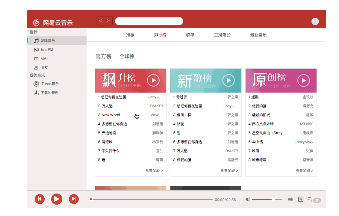 排行榜,歌单,电台,音乐播放,查看个人收藏歌单,登录,切换播放模式,改变音量,静音,改变歌曲进度。
